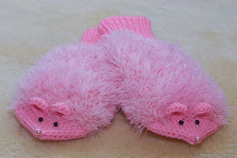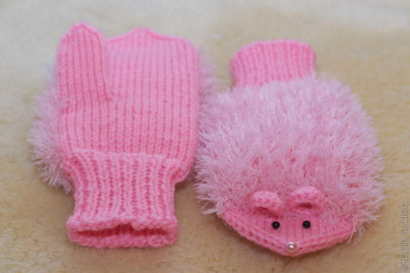 7. For the ears: 2 CP connect into the ring and knit 12 st s / n. Sew ears to the mitten. The nose and eyes made from beads.